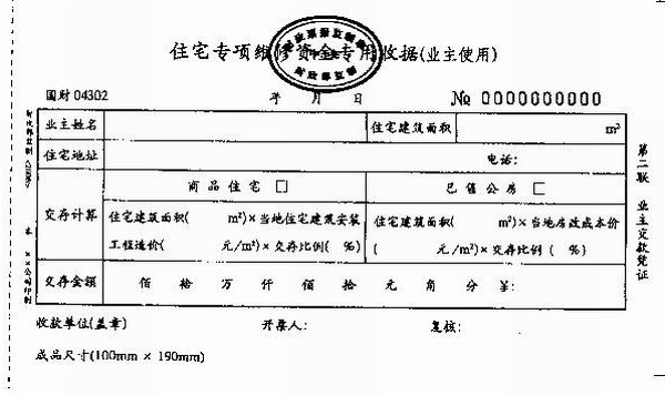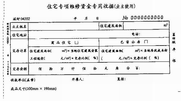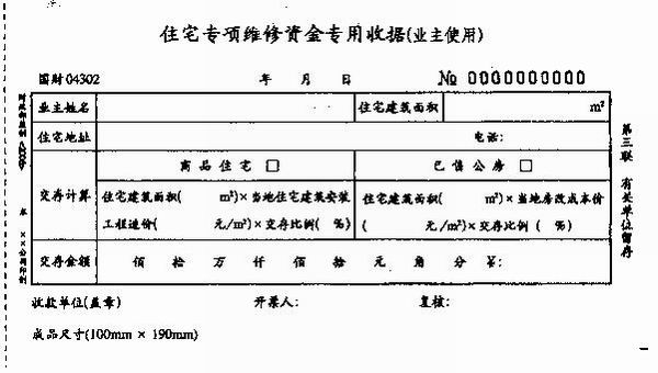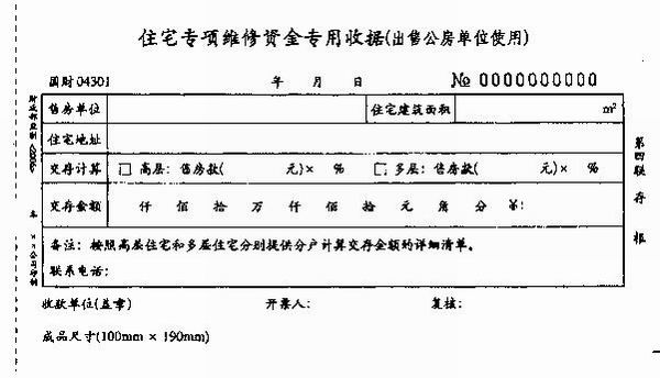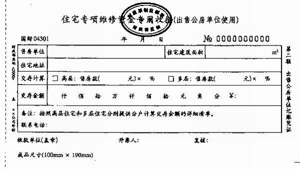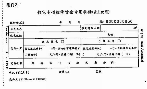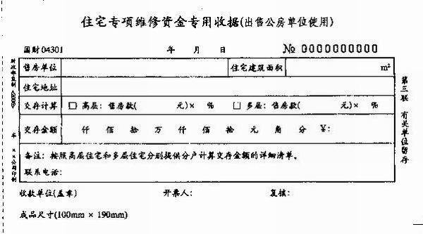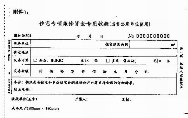 财政部关于发布住宅专项维修资金 专用票据样式的通知 各省、自治区、直辖市财政厅(局): 根据《住宅专项维修资金管理办法》(建设部、财政部令第165号)规定,现将有关票据使用事宜通知如下: 为了加强对住宅专项维修资金的管理,规范住宅专项维修资金专用票据的使用,从2008年3月1日起,各专户管理银行、代收住宅专项维修资金的售房单位在收取住宅专项维修资金时,应使用财政部或省、自治区、直辖市财政厅(局)统一印制的住宅专项维修资金专用收据(出售公房单位使用)(附件1)或住宅专项维修资金专用收据(业主使用)(附件2)。各财政票据监管部门应做好上述票据印制、发放等管理工作。 附件:1.住宅专项维修资金专用收据(出售公房单位使用) 2.住宅专项维修资金专用收据(业主使用) 中华人民共和国财政部 二○○八年一月十四日 主题词:住宅 资金 票据 通知 抄送:党中央有关部门,国务院各部委、各直属机构,总后勤部、武警总部,全国人大常委会办公厅,全国政协办公厅,高法院,高检院,有关人民团体。 财政部办公厅 印发160份 2008年1月16日印发
