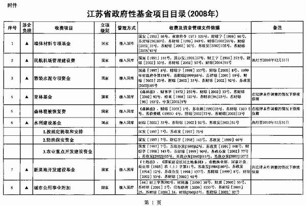 江苏省财政厅关于公布《江苏省政府性 基金项目目录(2008年)》的通知 省各部、委、办、厅、局,省各直属单位,各市、县财政局: 根据《财政部关于公布2007年全国政府性基金项目目录的通知》(财综[2008]11号)规定,我们重新编制了《江苏省政府性基金项目目录(2008年)》(以下简称《基金目录》),并公布全省执行。现就有关事项通知如下: 一、《基金目录》中公布的15项政府性基金项目是截止本通知发布时我省继续保留执行的政府性基金项目,其具体征收范围、征收标准、征收期限、资金管理方式等,应严格按照《基金目录》中注明的有关文件规定执行。本通知发布后,凡未列入《基金目录》公布的政府性基金项目一律作为取消项目处理,各级、各相关部门和单位应当停止执行,公民、法人和其他社会组织有权拒绝支付。对于本通知发布后新增、调整、取消政府性基金等政策,统一按照国家和省相关文件规定执行。 二、各级、各部门要迅速贯彻落实本通知的规定,认真进行对照清理,取消不合法、不合理的政府性基金项目,对超过规定标准的要坚决予以降低,对扩大范围的行为要予以纠正。同时,对于列入《基金目录》公布的项目,应规范管理,严禁擅自增加项目、提高标准、扩大范围。各级、各部门应严格执行政府性基金审批权限,凡需设立政府性基金项目的,应按规定程序进行审批。 三、本通知发布以后,《江苏省财政厅关于公布<江苏省政府性基金项目目录(2007年)>的通知》(苏财综[2007]60号)同时废止。 附件:《江苏省政府性基金项目目录(2008年)》 江苏省财政厅 二○○八年九月八日 主题词:基金 项目 目录 通知 江苏省财政厅办公室 2008年9月9日印发 共印200份
