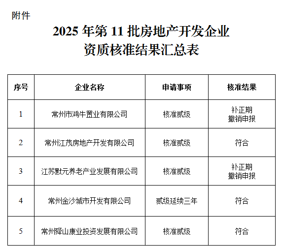 根据《中华人民共和国城市房地产管理法》《城市房地产开发经营管理条例》(国务院令第248号)和《房地产开发企业资质管理规定》(部令第54号)等法规以及有关文件规定,现将我局核准的2025年第11批房地产开发企业资质结果予以公告。