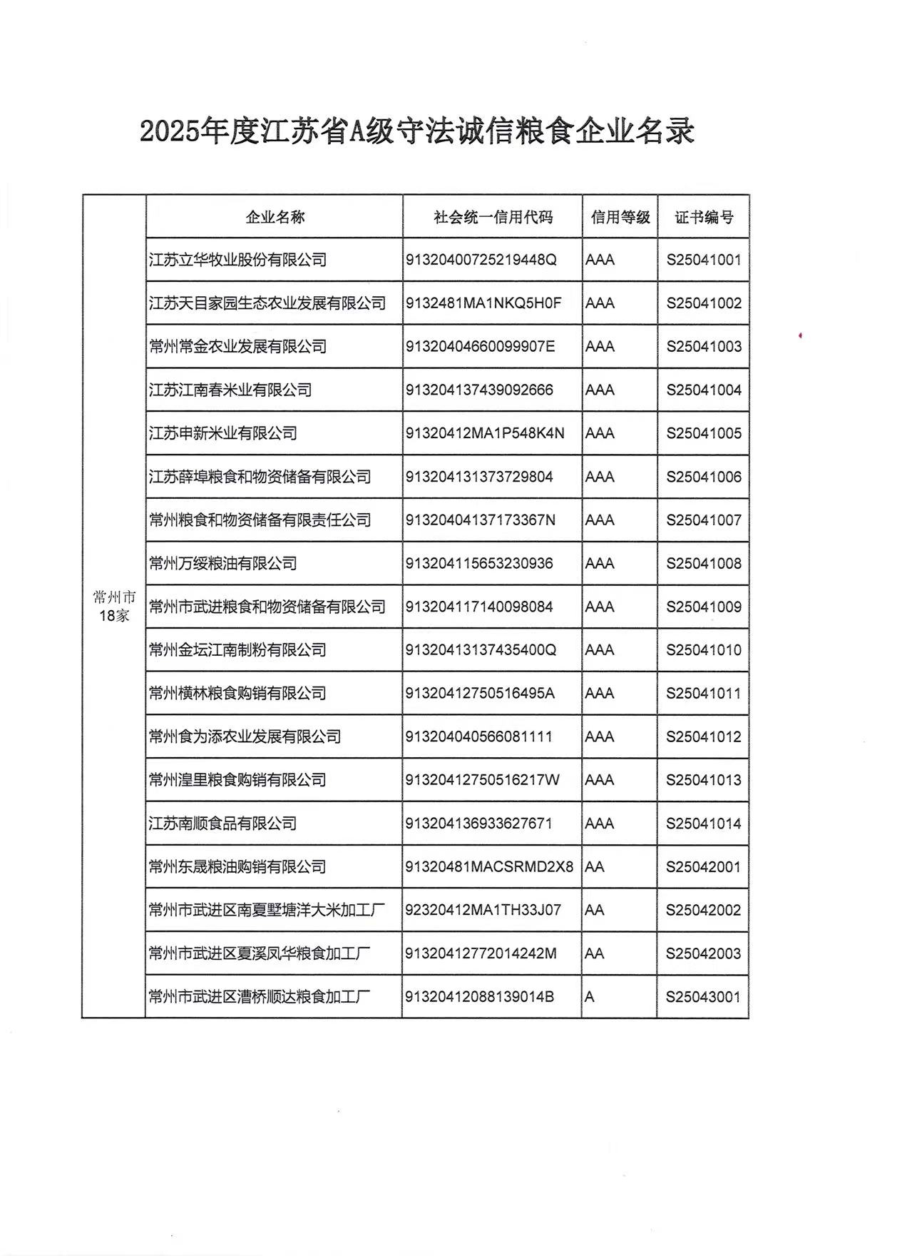 根据《江苏省粮食企业信用监管实施细则》(苏粮法规〔2023〕2号),省粮食和物资储备局指导各设区市、县(市、区)粮食和物资储备部门,对全省1845家粮食企业2025年度信用状况进行了综合评价,评出A级企业897家。为激励先进,营造守法诚信的粮食流通市场环境,现将其中常州市的A级企业名录予以公布,并就有关事项公告如下: