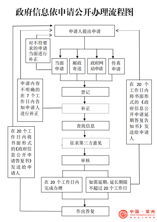 3、在线申请:申请人进入常州市人民政府门户网站首页-“政务公开”栏目-“依申请公开”页面,在线填写电子版《常州市人民政府信息公开申请表》提交申请。