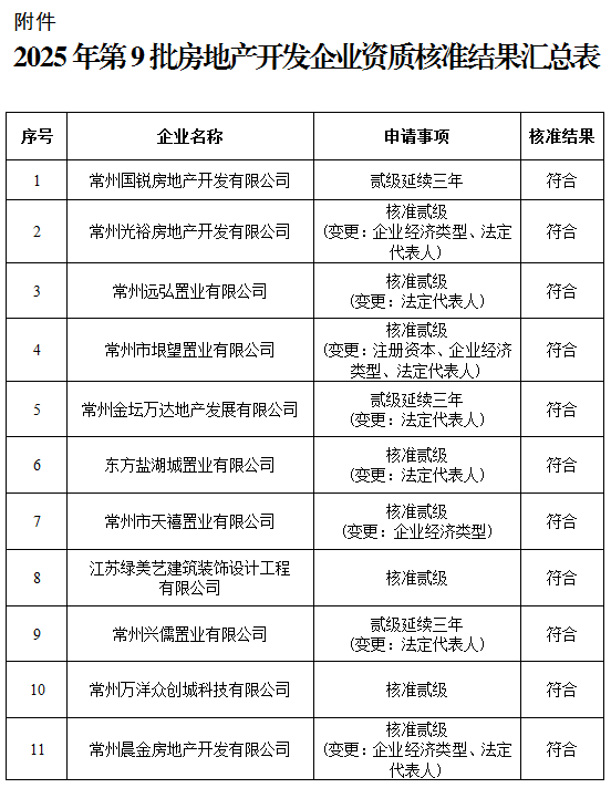 根据《中华人民共和国城市房地产管理法》《城市房地产开发经营管理条例》(国务院令第248号)和《房地产开发企业资质管理规定》(部令第54号)等法规以及有关文件规定,现将我局核准的2025年第9批房地产开发企业资质结果予以公告。