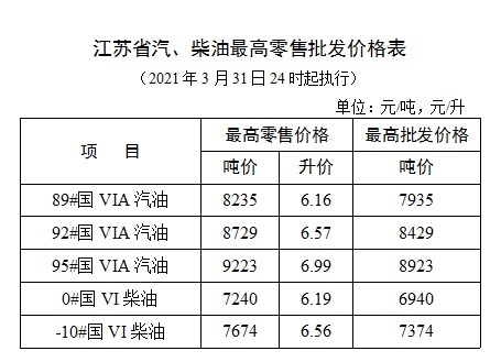根据国家发展改革委公布的国内成品油价格调价信息,现将我省汽、柴油最高零售、批发价格公布如下,自2021年3月31日24时起执行。