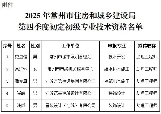 附件:2025年常州市住房和城乡建设局第四季度初定初级专业技术资格名单