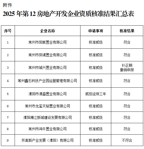 根据《中华人民共和国城市房地产管理法》《城市房地产开发经营管理条例》(国务院令第248号)和《房地产开发企业资质管理规定》(部令第54号)等法规以及有关文件规定,现将我局核准的2025年第12批房地产开发企业资质结果予以公告。