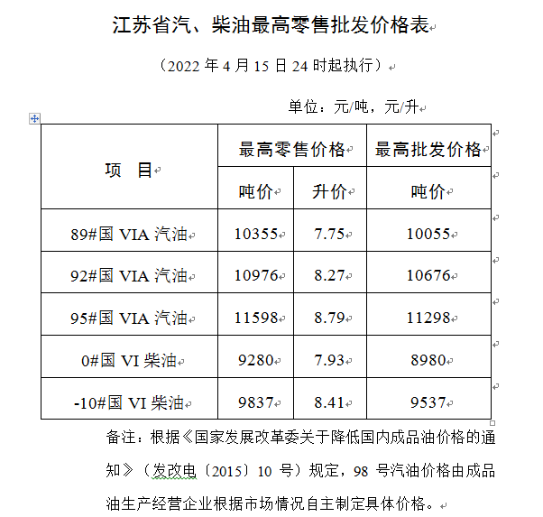 根据国家发展改革委公布的国内成品油价格调价信息,现将我省汽、柴油最高零售、批发价格公布如下,自2022年4月15日24时起执行。