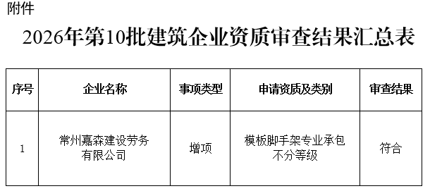 根据《中华人民共和国建筑法》 、 《中华人民共和国行政许可法》、《建筑业企业资质管理规定》(部令第22号)、《建筑业企业资质标准》(建市〔2014〕159号)等法规及有关规定,现将我局审查的2026年第10批建筑业企业资质结果予以公告。