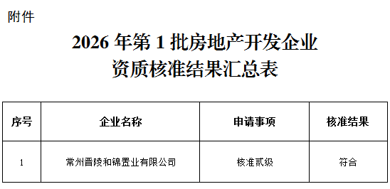 根据《中华人民共和国城市房地产管理法》、《城市房地产开发经营管理条例》(国务院令第248号)和《房地产开发企业资质管理规定》(住房和城乡建设部令第54号)等法律法规及有关文件规定,现将我局核准的2026年第1批房地产开发企业资质结果予以公告。
