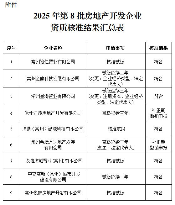附件: 2025年第8批房地产开发企业资质核准结果汇总表