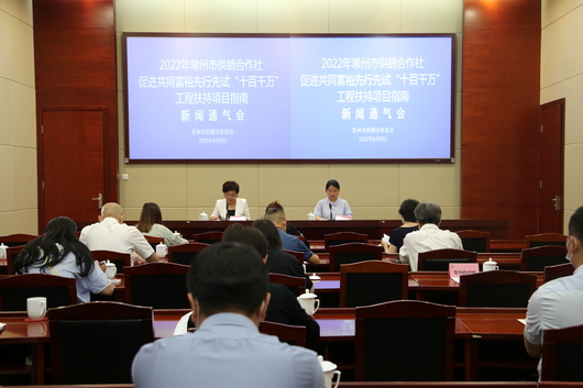 各位媒体朋友,大家上午好!欢迎出席今天的新闻通气会。作为全省供销合作社促进共同富裕工作唯一试点单位,常州市供销合作总社加快推进“532”重点项目供销促进共同富裕“十百千万”先行先试行动,率先探索共同富裕供销为农服务新路径,助力打造共同富裕常州样板。今天通气会将由市供销总社党组成员、理事会副主任、新闻发言人张萍霞向大家解读《2022年常州市供销合作社促进共同富裕先行先试“十百千万”工程扶持项目指南》。下面请张萍霞副主任做相关解读,大家欢迎!