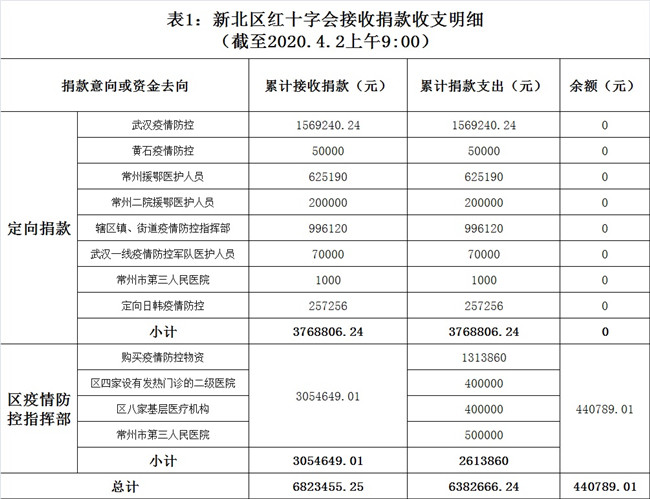 新北区红十字会自2020年1月28日发布捐赠倡议书以来,陆续收到众多爱心企业、社会团体和爱心人士的捐款。截至2020年4月2日上午9时,新北区红十字会累计接收捐款6823455.25元,累计支出6382666.24元(详见表1)。捐赠物资分配详见表2。