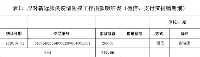 2020年6月22日上午9时至2020年7月3日上午9时,新北区红十字会共收到捐款260元(详见表1)。