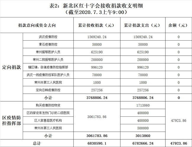 截至2020年6月22日上午9时,新北区红十字会累计接收捐款6830590.1元,累计支出6782666.24元(详见表2)。捐赠物资分配详见表3。