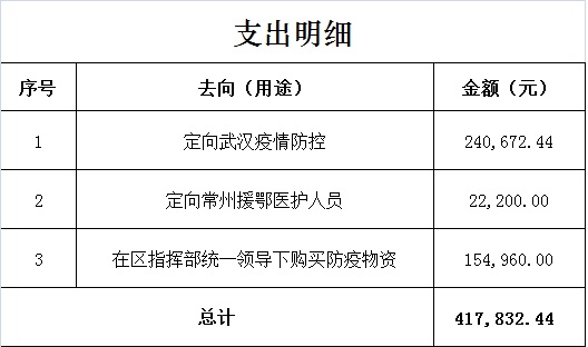 2020年3月10日上午9时至2020年3月11日上午9时,新北区红十字会共接收捐款31933.26元(详见表1),支出417832.44元(详见表2)。