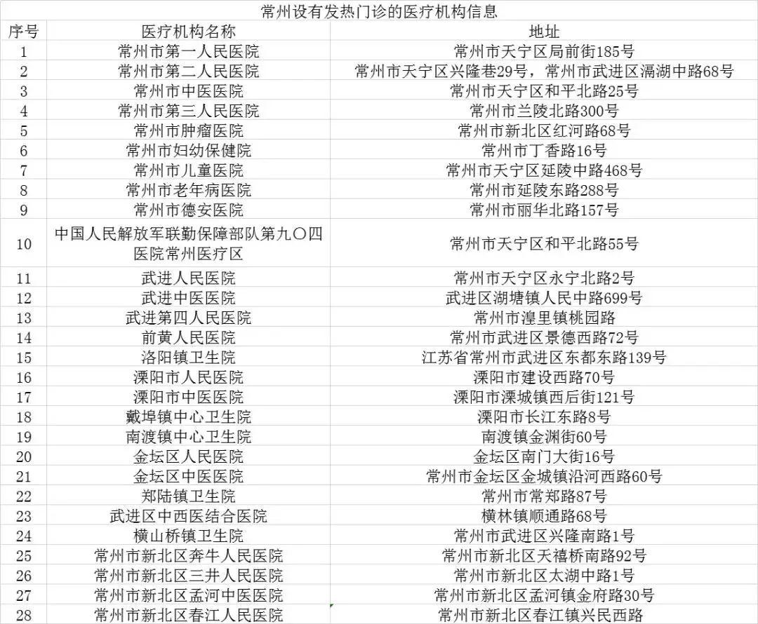 4、严格落实农贸市场等重点场所常态化防控措施。科学、规范、有效开展日常消毒工作,突出清理卫生死角盲区。规范开展病媒生物防制工作,消除鼠、蟑、蚊、蝇等病媒生物孳生环境。保持场所内清洁卫生,配备足够的洗手设施。加强空调使用管理以及室内空气流动,定期开窗、开门或开启换风扇等换气装置。市民前往农贸市场、超市、医院等人员密集场所,应遵守场所防疫管理规定,自觉佩戴口罩,排队时保持1米以上距离,并可监督相关责任主体做好相应防控工作。目前,常州各家医疗机构采取分时预约就诊,为了方便大家就近就诊,下面公布了常州28家设有发热门诊的医疗机构名单、地址,去医院前,可先进行查询预约,到离您最近的医院发热门诊就诊。