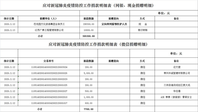 2020年2月12日上午9时至2020年2月13日上午9时,新北区红十字会共接收捐款313000 元。支出295300元(定向常州援鄂医护人员 )。