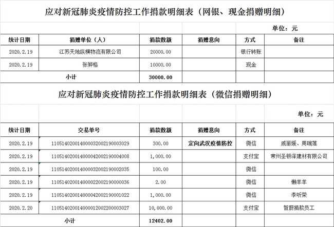 2020年2月19日上午9时至2020年2月20日上午9时,新北区红十字会共接收捐款42402元。