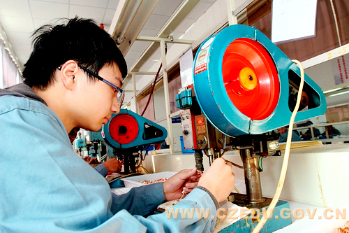 在另外一幢实训楼的四楼,有一个特别的教室,看上去更像一个企业车间。采访中记者了解到,其实,它真的就是车间——位于武进坂上的英特曼电气有限公司,直接把一个组装车间搬到了这里。机电专业每个一年级新生,都必须轮流到这里参加为期一月的流水线工作。