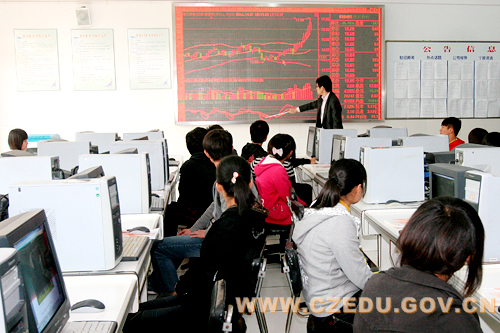 “证券模拟厅”教室里,年轻男教师商晔楠正在给学生上课。黑板上是满满一面红红绿绿的实时证券K线图。30多个学生聚精会神地听课,教室一隅竟然还煞有介事地设了“大户室”。商老师大学学的是计算机专业,开过公司,在上海证券机构从业过,持有证券从业资格证,今年应聘当上了职教中心的教师。他说:“我很注重实践应用,课堂上主要给学生讲授基本的理财知识,比如:成交量、技术指标、股票基本面分析等。掌握这些基础知识,对学生今后找工作会有利。”