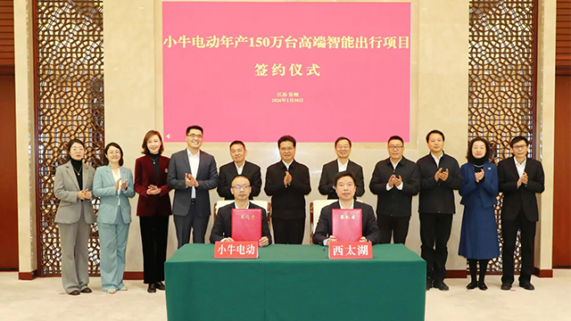 1月30日,江苏小牛电动科技有限公司新项目签约落地常州西太湖科技产业园,年产能将新增150万台高端智能两轮电动车。小牛电动创始人李一男、董事长兼CEO李彦,市委书记王剑锋,市委副书记、市长周伟出席活动。