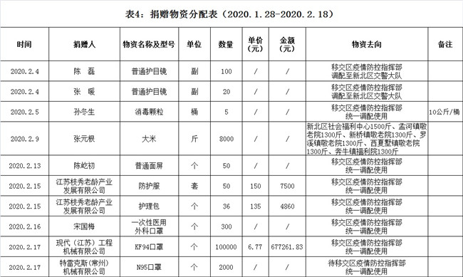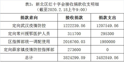 截至2020年2月18日上午9时,新北区红十字会累计接收捐款3824299.89元,护目镜120副、消毒颗粒50千克、大米8000斤、防护面屏50个、防护服50套、护理包36个、口罩102300个。累计支出3482849.86元,其中:定向武汉捐赠支出1207549.86元,定向常州援鄂医护人员支出295300元;在新北区新冠肺炎疫情防控应急指挥部统一领导下向常州市第三人民医院拨付防疫专款500000元、区四家设有发热门诊的二级医院共拨付400000元、区八家基层医疗机构共拨付400000元、购买疫情防控物资支出680000元。物资由指挥部统一调配用于一线疫情防控工作。