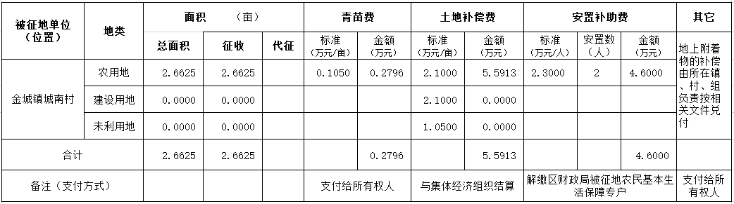 常州市金坛区自然资源和规划局呈报的“一书四方案”:《建设用地项目呈报说明书》、农用地转用方案、补充耕地方案、征收土地方案、供地方案于2020年3月6日已经省政府批准,批准文号为苏政地〔2020〕38号。根据《中华人民共和国土地管理法》第四十六条、国土资源部令第10号《征收土地公告办法》和《江苏省土地管理条例》等有关规定,现将该批次征收所涉及金城镇城南村的有关征地补偿、安置方案的有关内容和事项公告如下: