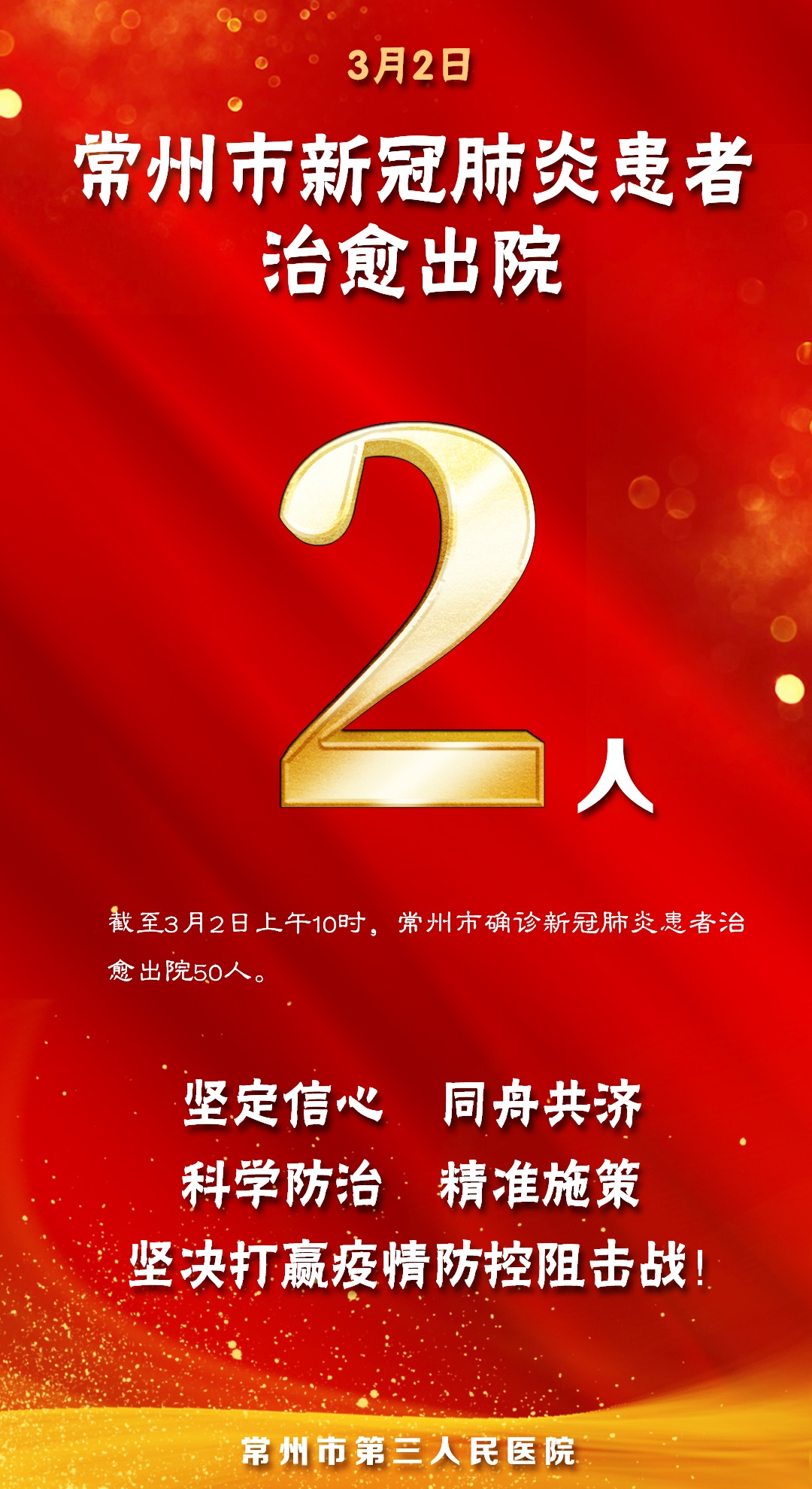 3月2日上午10时,常州市第三人民医院确诊病例治愈出院再增2人。截至目前,常州市确诊出院病例共计50人。