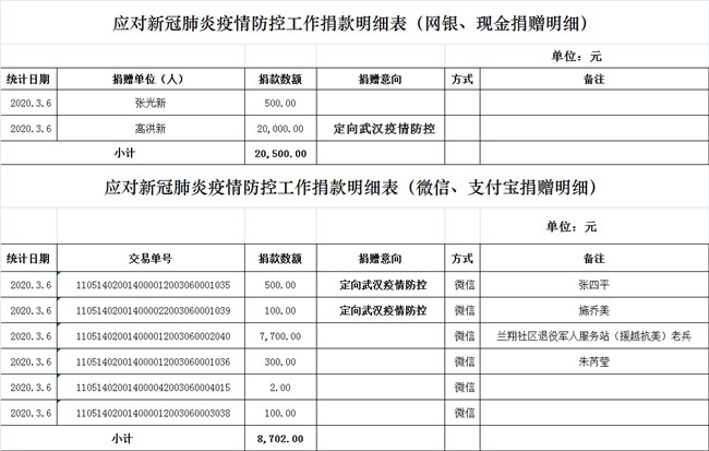 2020年3月6日上午9时至2020年3月7日上午9时,新北区红十字会共接收捐款29202元(详见表1)。
