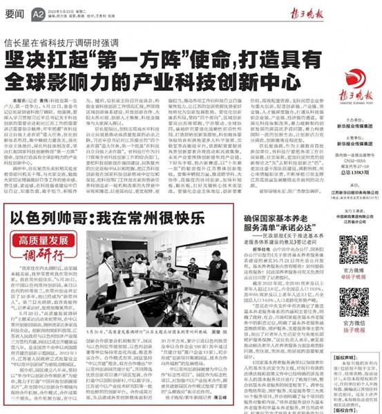 5月23日 《扬子晚报》刊载题为《高质量发展调研行——以色列帅哥:我在常州很快乐》的报道,点赞园区作为标志性项目,在中以创新合作领域内保持合作机制、合作模式、合作成果三个领先,致力于打造“中国开放创新靓丽名片”,并在推动中以两国深厚友谊和全方位交流中发挥积极作用。