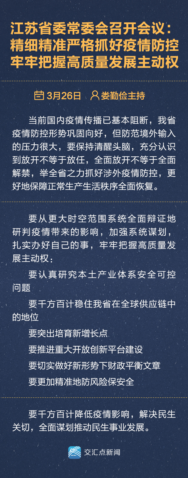 3月26日,江苏省委常委会召开会议,深入贯彻习近平总书记重要讲话指示精神,研究当前相关重点工作,部署下一阶段任务。省委书记娄勤俭主持会议并讲话,强调要持续抓好新冠肺炎疫情防控工作,以高度的定力和坚定的信心推动高质量发展,鼓足干劲,迎难而上,奋力夺取疫情防控和经济社会发展的双胜利。