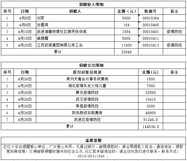 2020年常州武进区红十字会日常捐赠收支明细(4月)