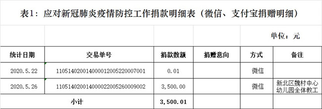 2020年5月22日上午9时至2020年5月29日上午9时,新北区红十字会共收到捐款3500.01元(详见表1)。