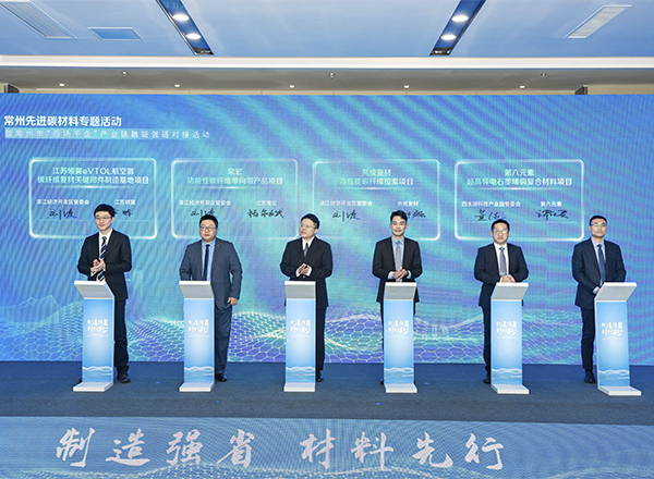 现场,江苏领翼eVTOL航空器碳纤维复材关键部件制造基地、常宏功能性碳纤维单向带产品、共成复材高性能碳纤维拉索、第六元素超高导电石墨烯铜复合材料等一批优质项目签约。