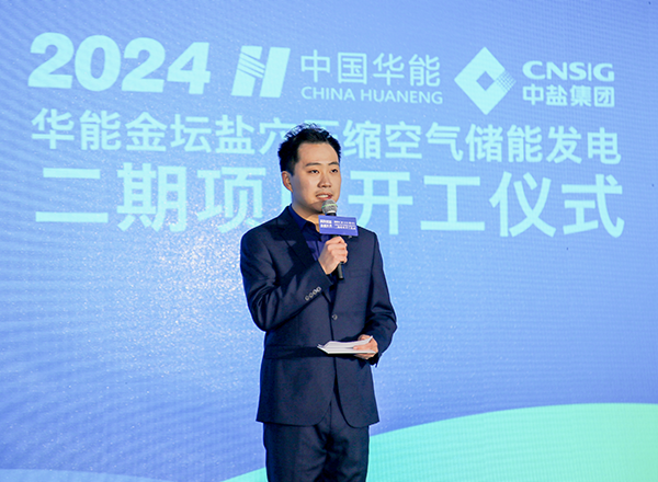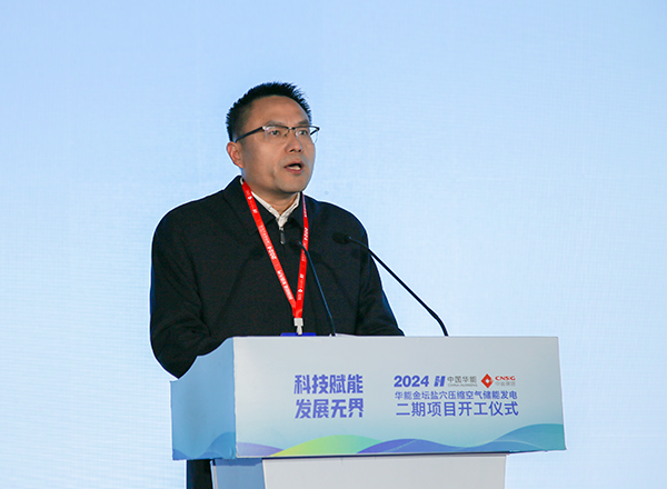 曹庆伟、敦忆岚、闵勇分别致辞。华能中盐(常州)储能有限公司总经理张宪岭介绍华能金坛盐穴压缩空气储能发电二期项目总体情况。