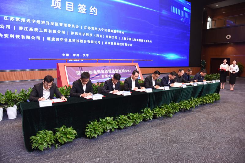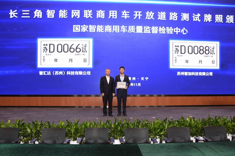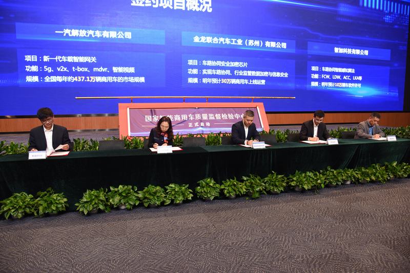 现场,周毅彪和凌耀初向智汇达(苏州)、智加科技颁发首批长三角智能网联商用车开放道路测试牌照。乔东、梁一波、宋建伟、许小波、国家ITS中心智能驾驶及智能交通产业研究院常务副院长叶佳勇共同启动国家智能商用车质量监督检验中心。当天,联通网络技术研究院、一汽解放、苏州金龙、智加科技与国家ITS中心智能驾驶研究院签约合作。同时长沙智能驾驶研究院有限公司、香江系统工程有限公司等企业在天宁区签约落地。
