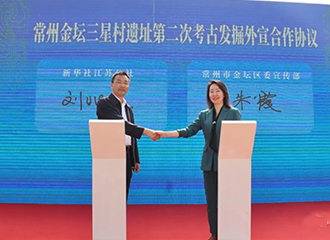 三星村遗址联合考古队代表郑铎发言。新华社江苏分社与金坛区委宣传部签订三星村遗址第二次考古发掘外宣合作协议。中国社科院考古研究所、江苏省文物考古研究院、常州市考古研究所、金坛区博物馆签订联合考古协议。江苏省文物局、江苏省文物研究院、常州市文广旅局共同为三星村遗址联合考古队赠送考古发掘包。中国社科院考古研究所史前考古研究室主任李新伟为三星村遗址联合考古队授旗。